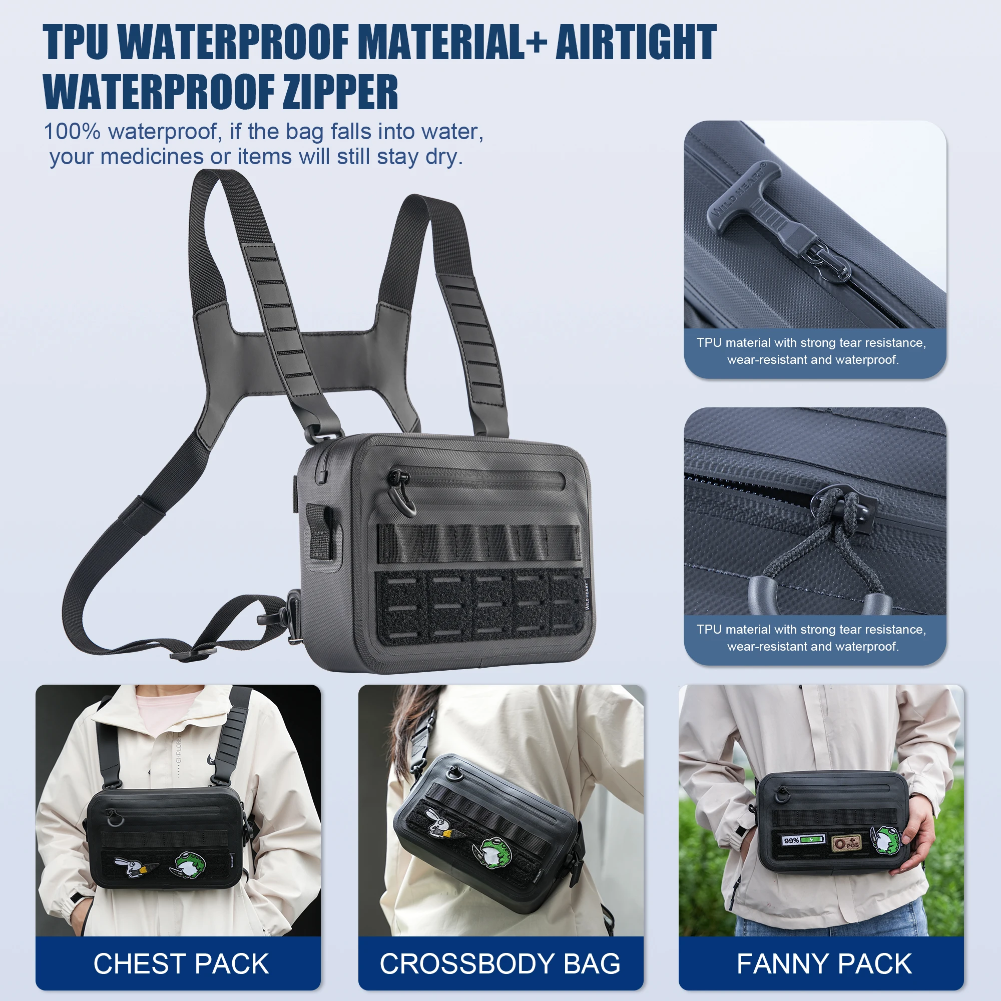 The tactical chest bag is made of waterproof material TPU through high-frequency voltage seamless technology, which is waterproof and wear-resistant