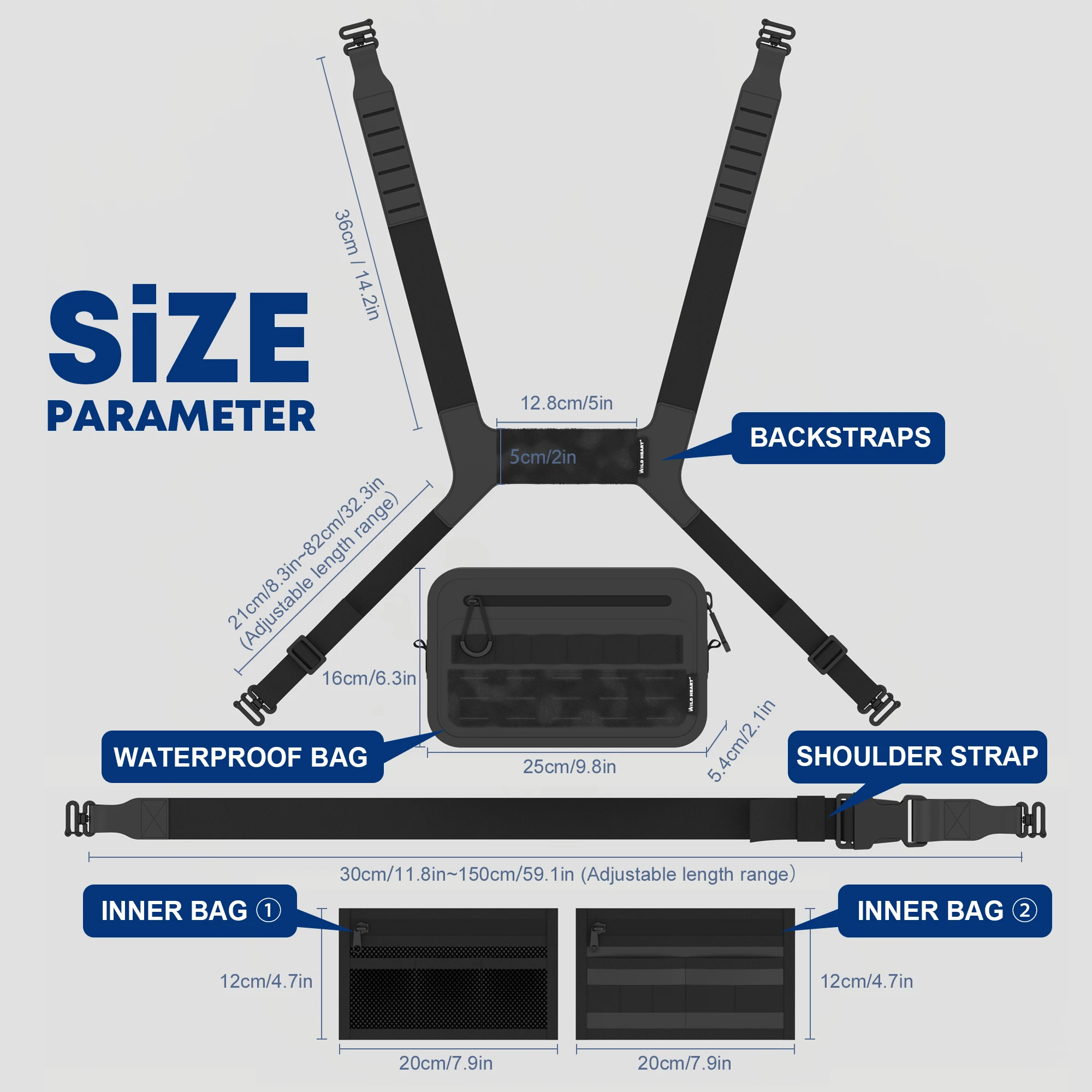 The shoulder straps are adjustable. The H-shaped straps and shoulder straps can be adjusted in length. The longest shoulder strap can be adjusted to 150CM. It is suitable for almost all body types. Whether it is a strong man or a plump woman, it can be worn comfortably